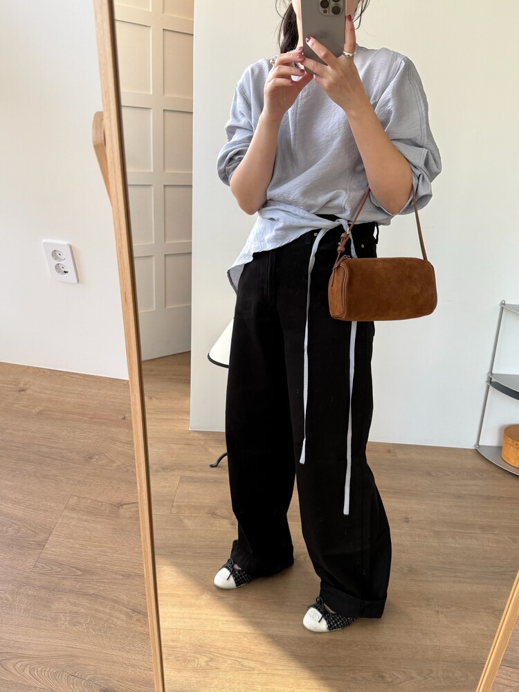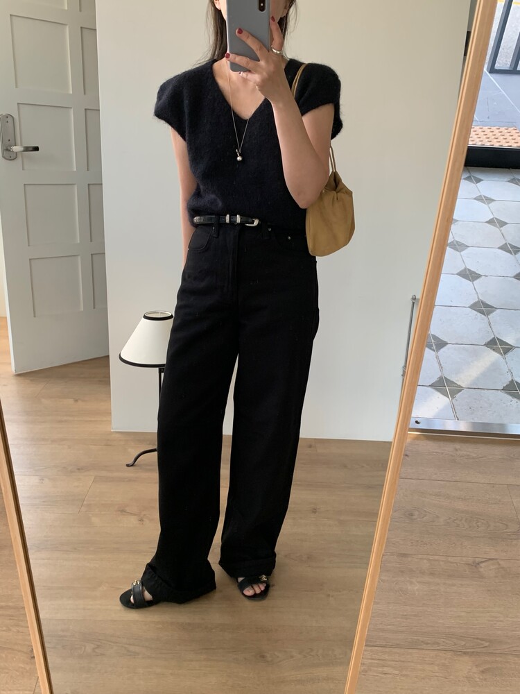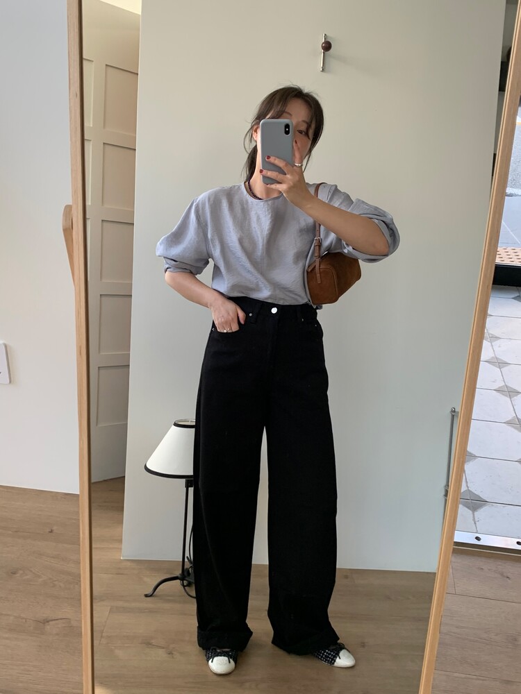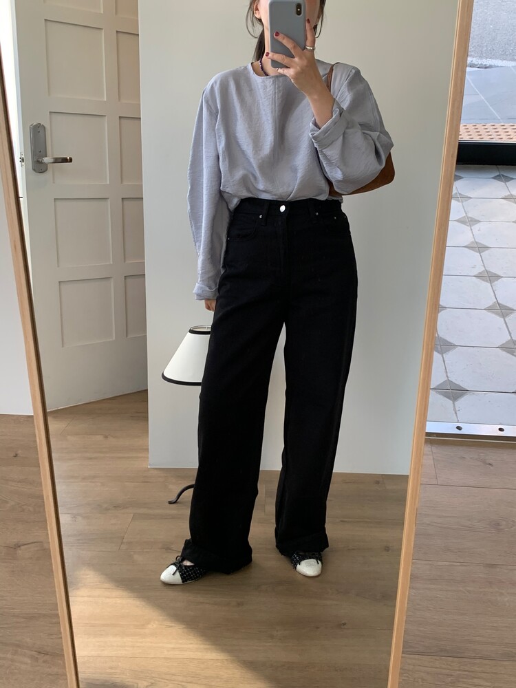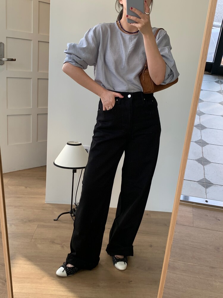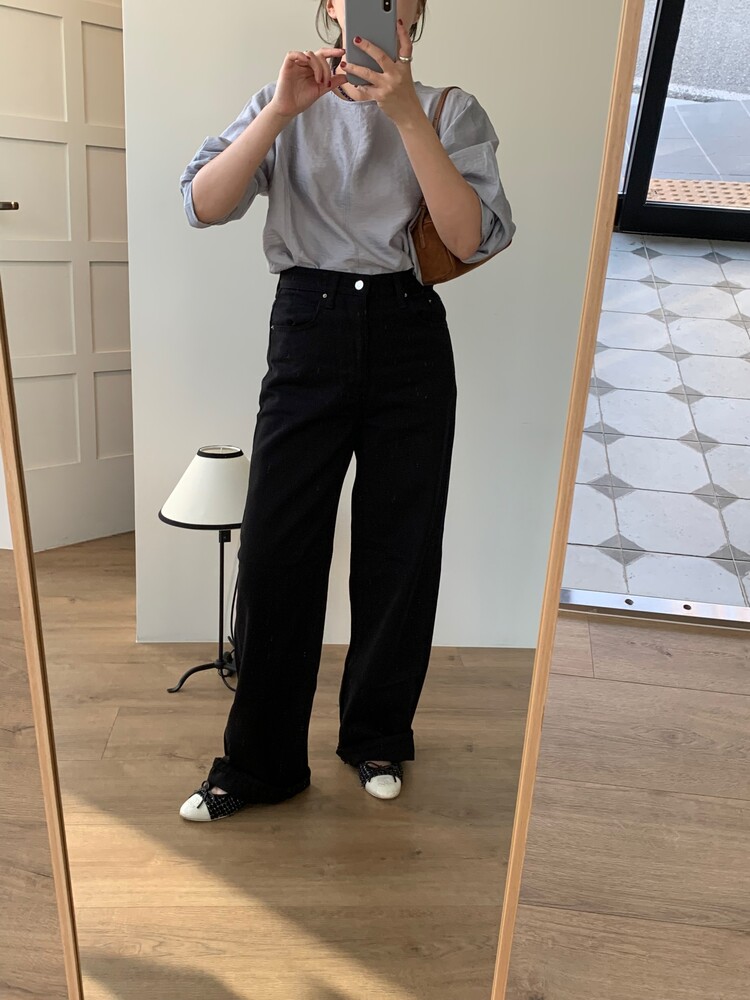 일자로 떨어지는 와이드한 핏의 데님팬츠로 부드럽고 유연한