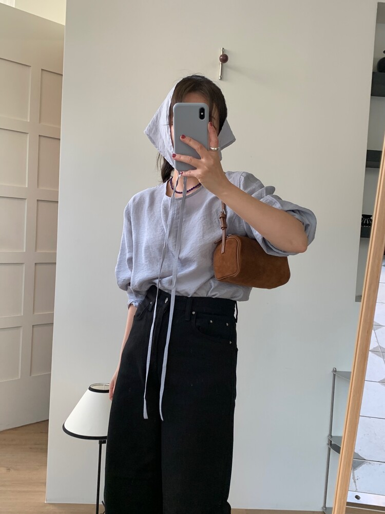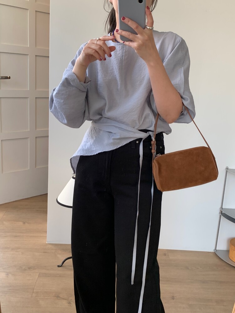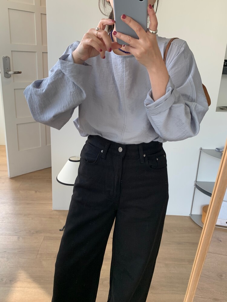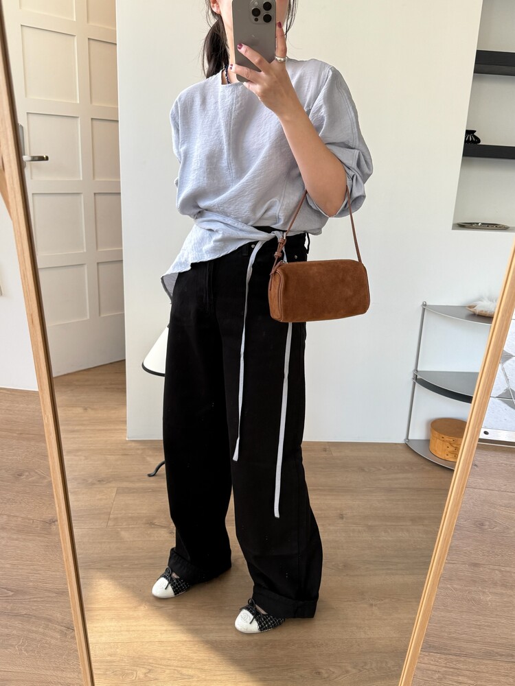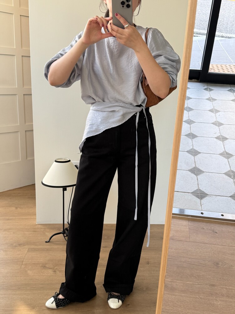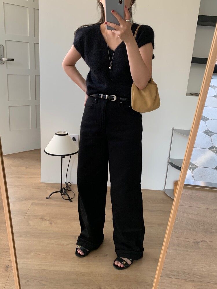 일자로 떨어지는 와이드한 핏의 데님팬츠로 부드럽고 유연한