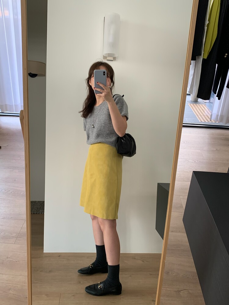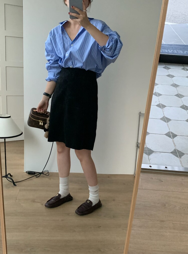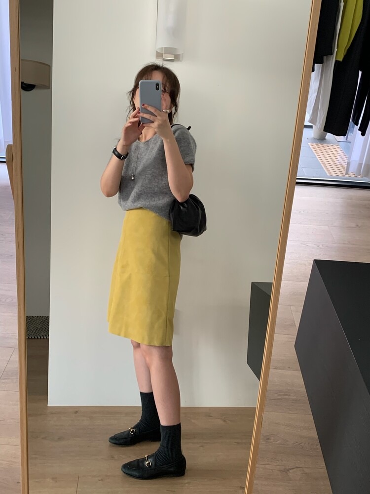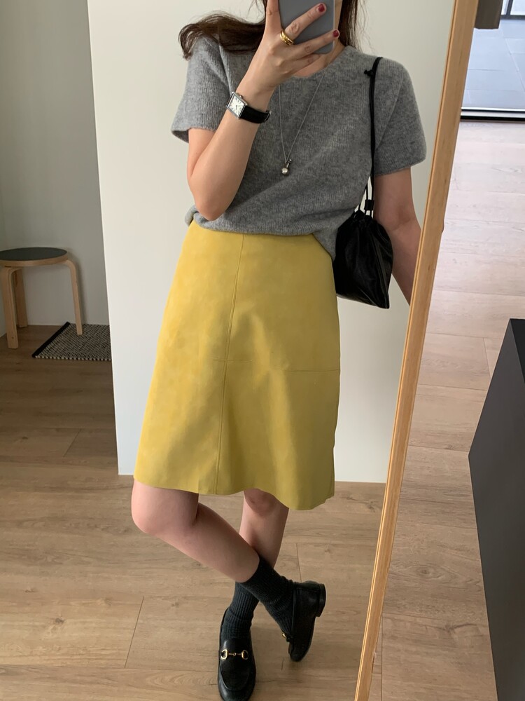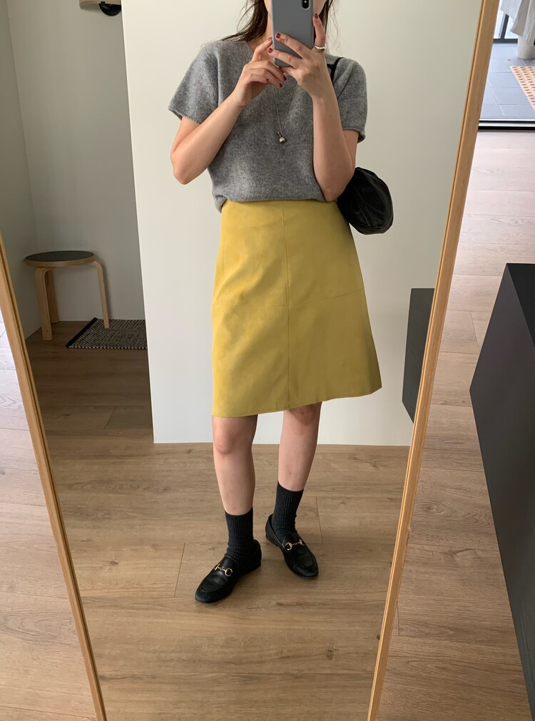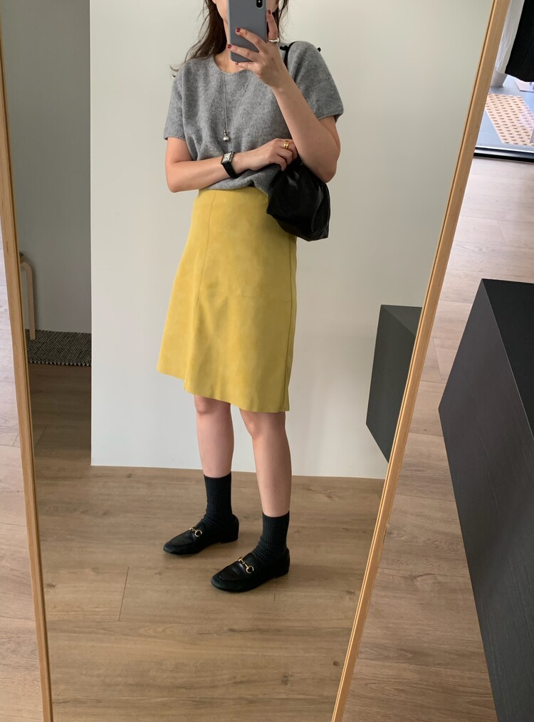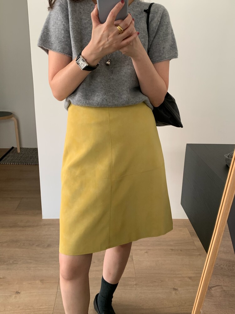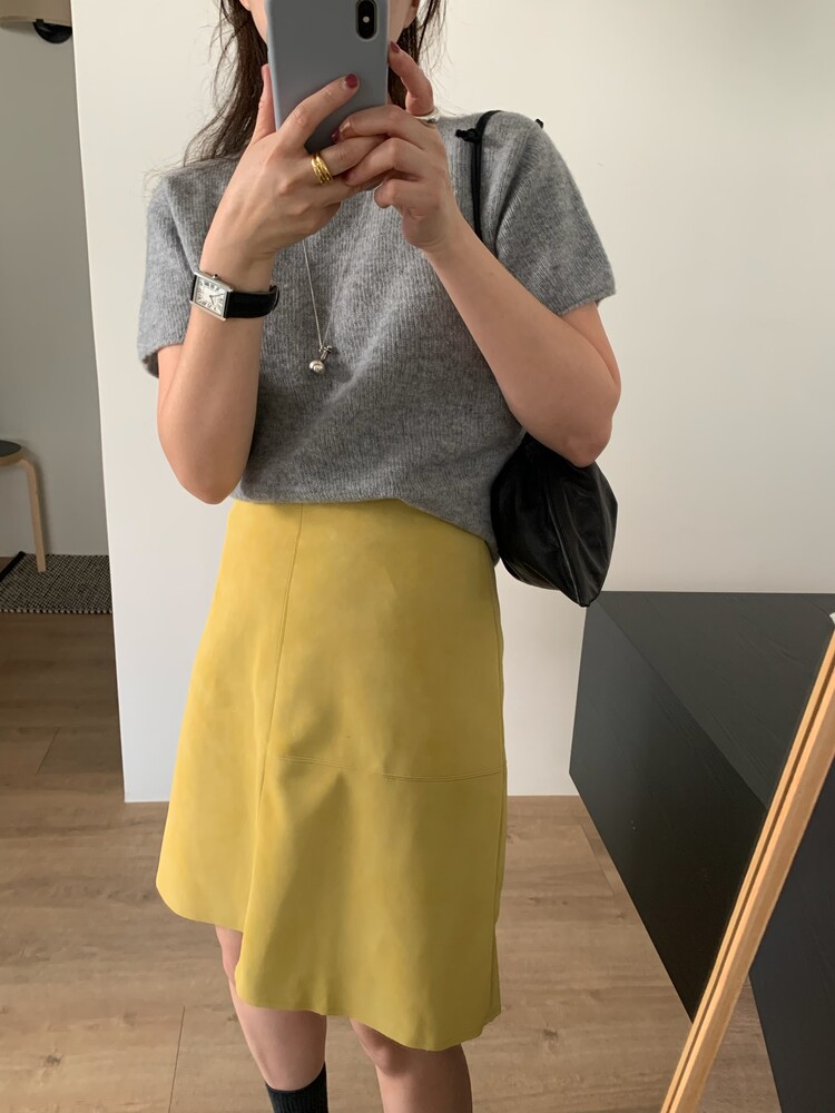 에이라인 핏으로 착용되는 스웨이드 소재의 스커트입니다