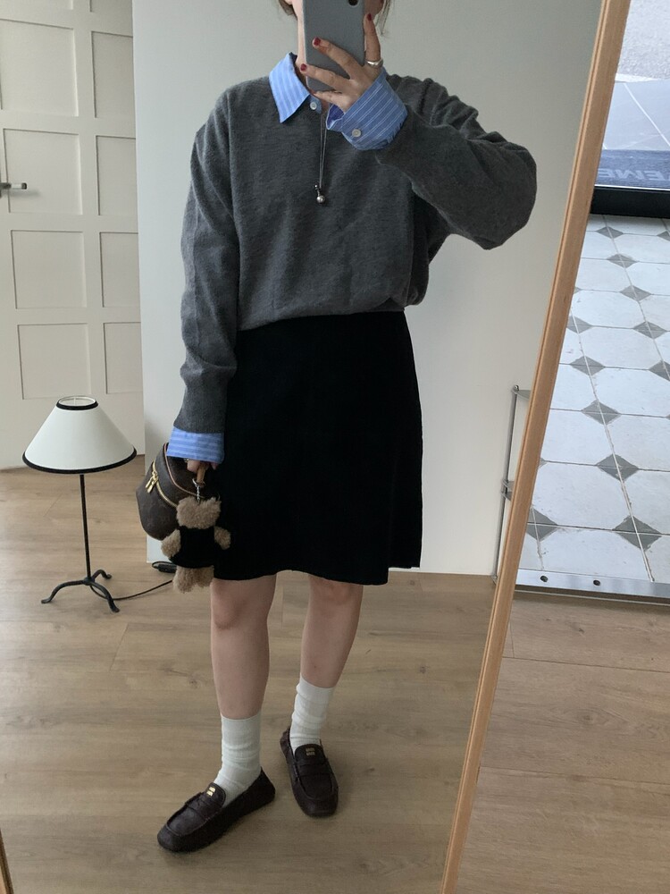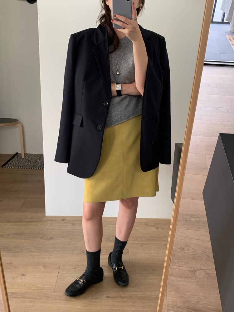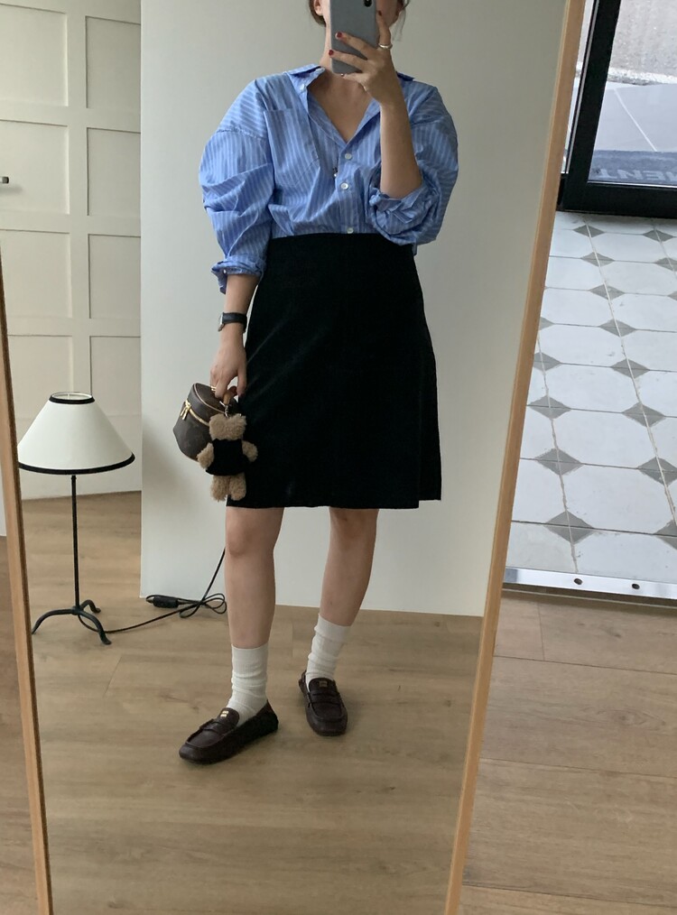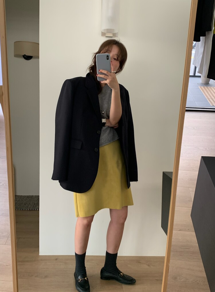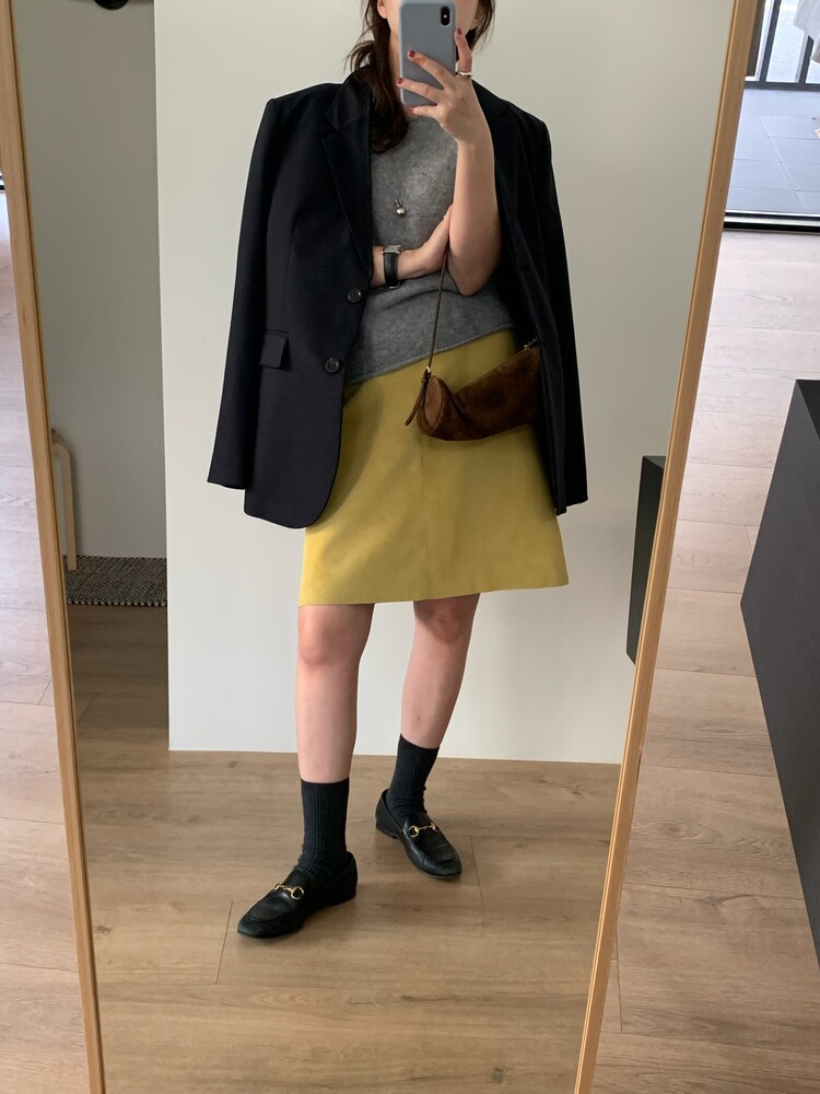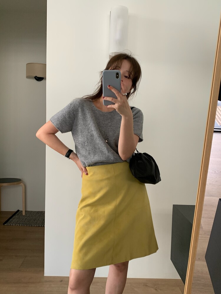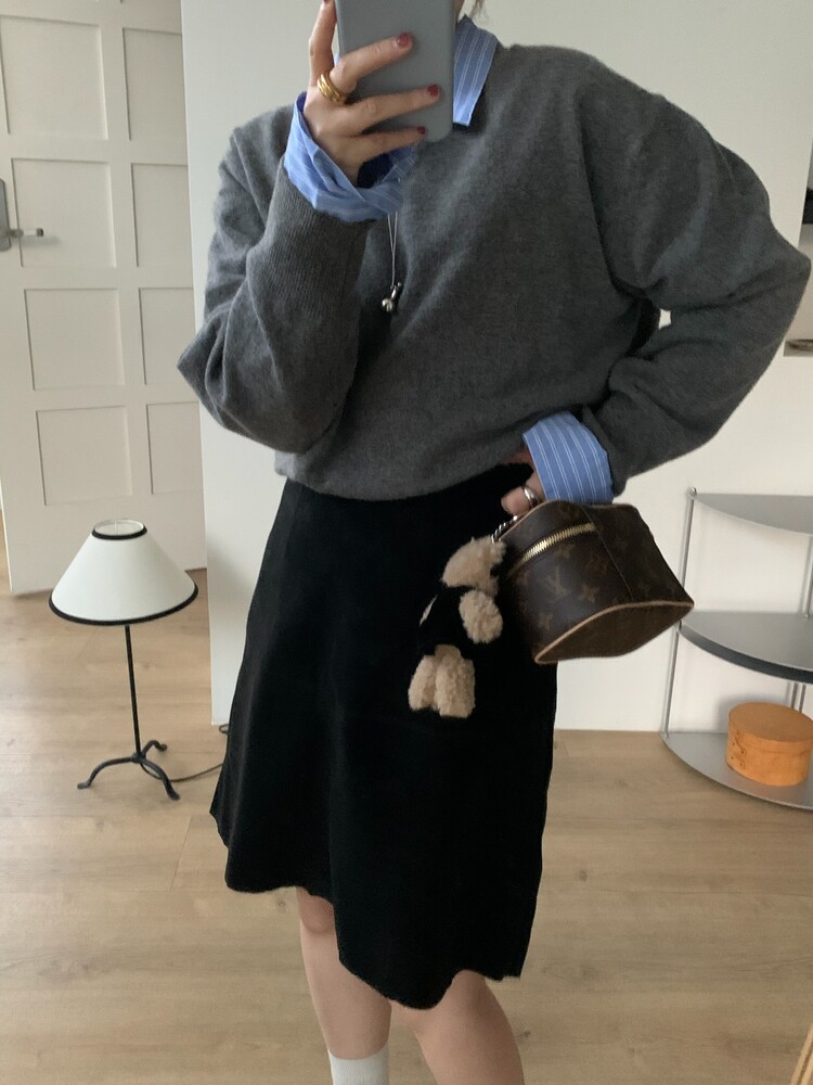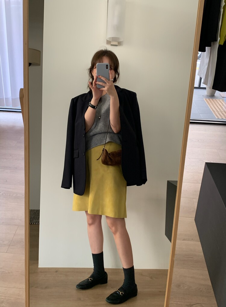 에이라인 핏으로 착용되는 스웨이드 소재의 스커트입니다