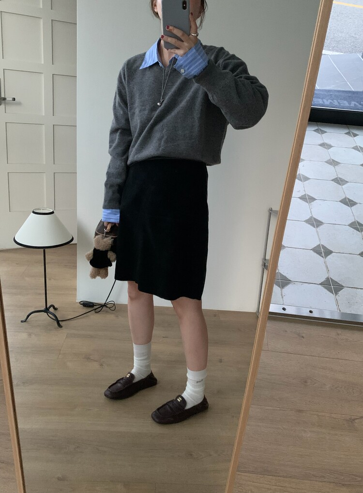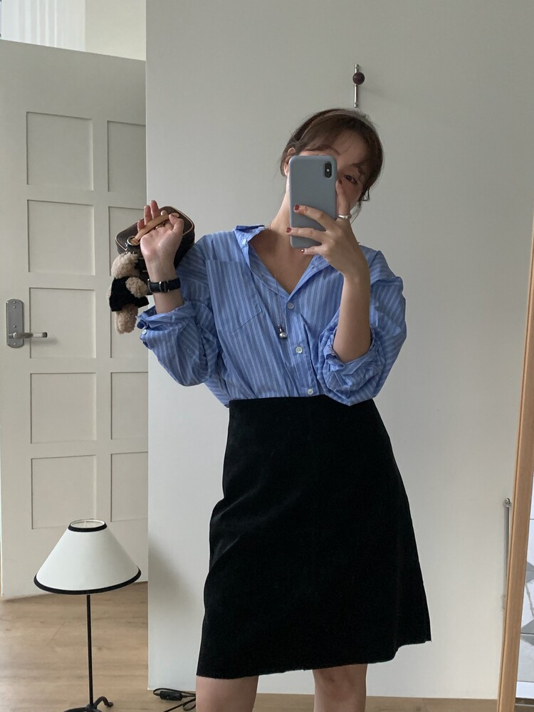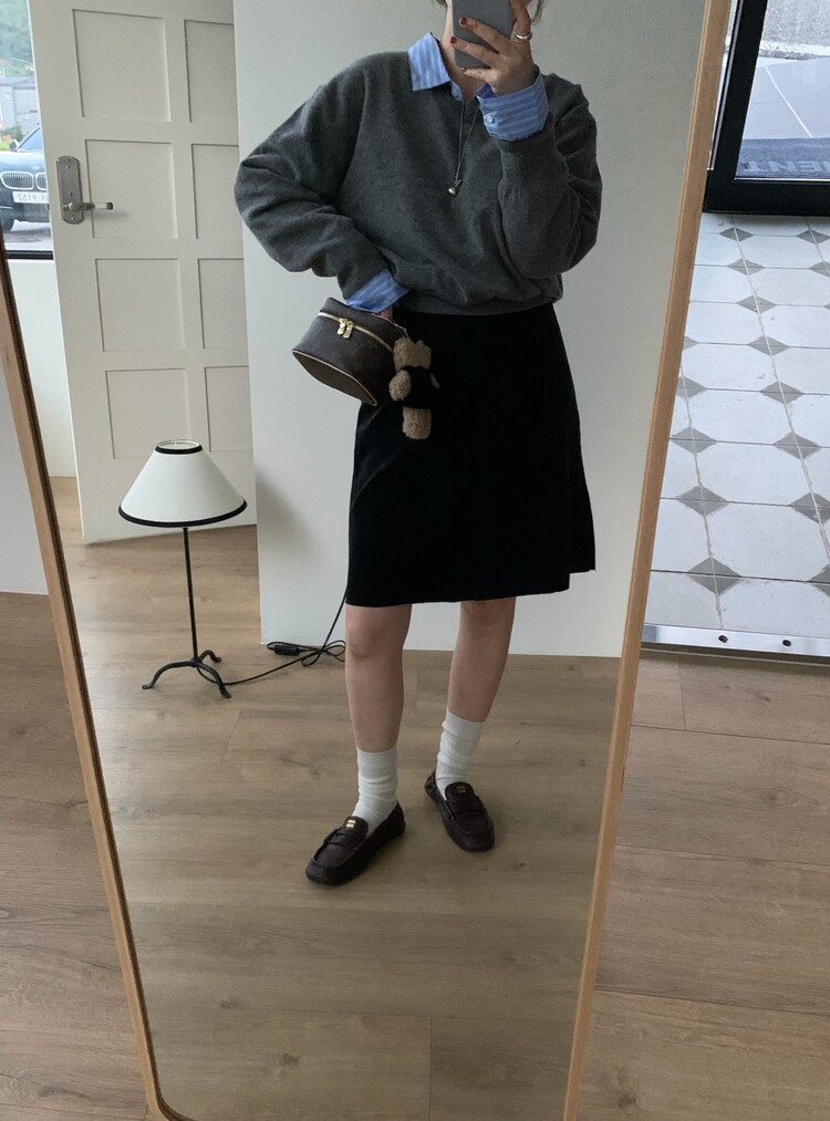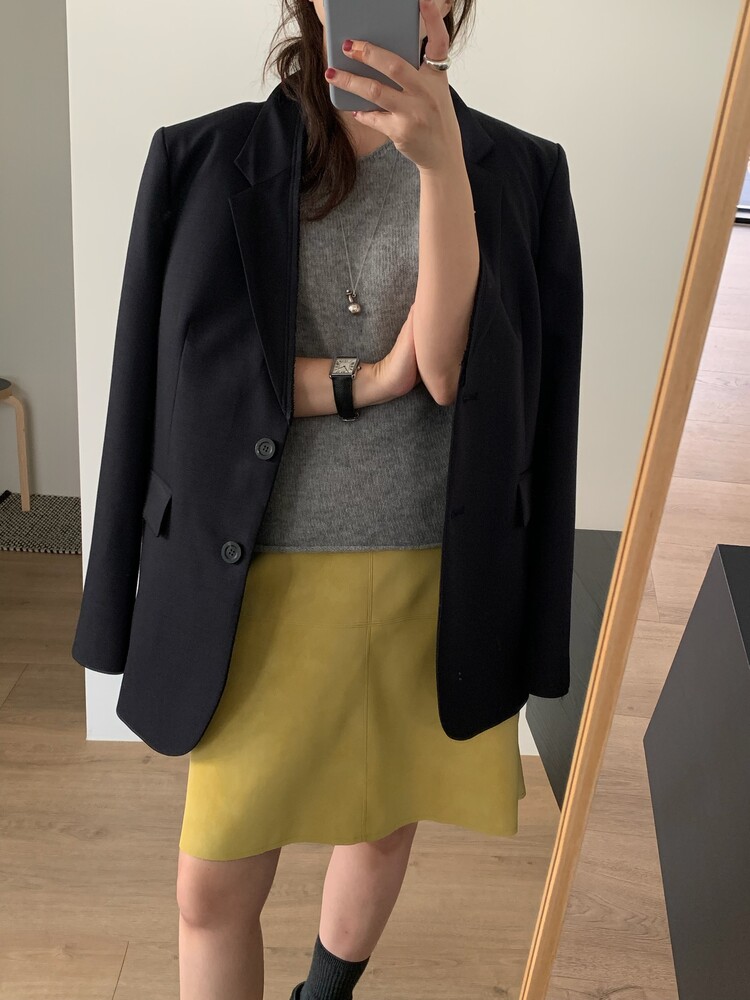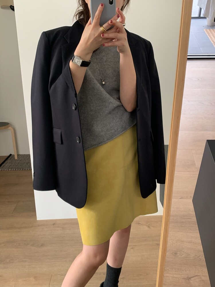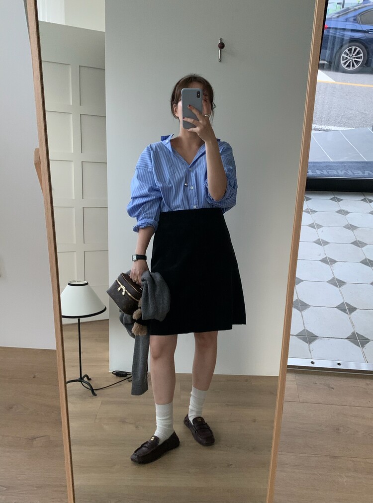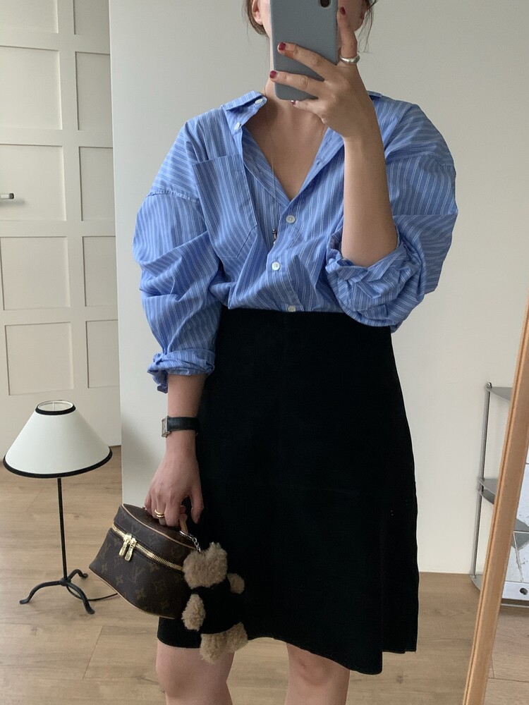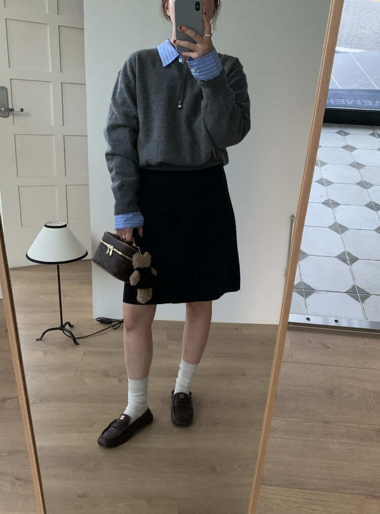 에이라인 핏으로 착용되는 스웨이드 소재의 스커트입니다