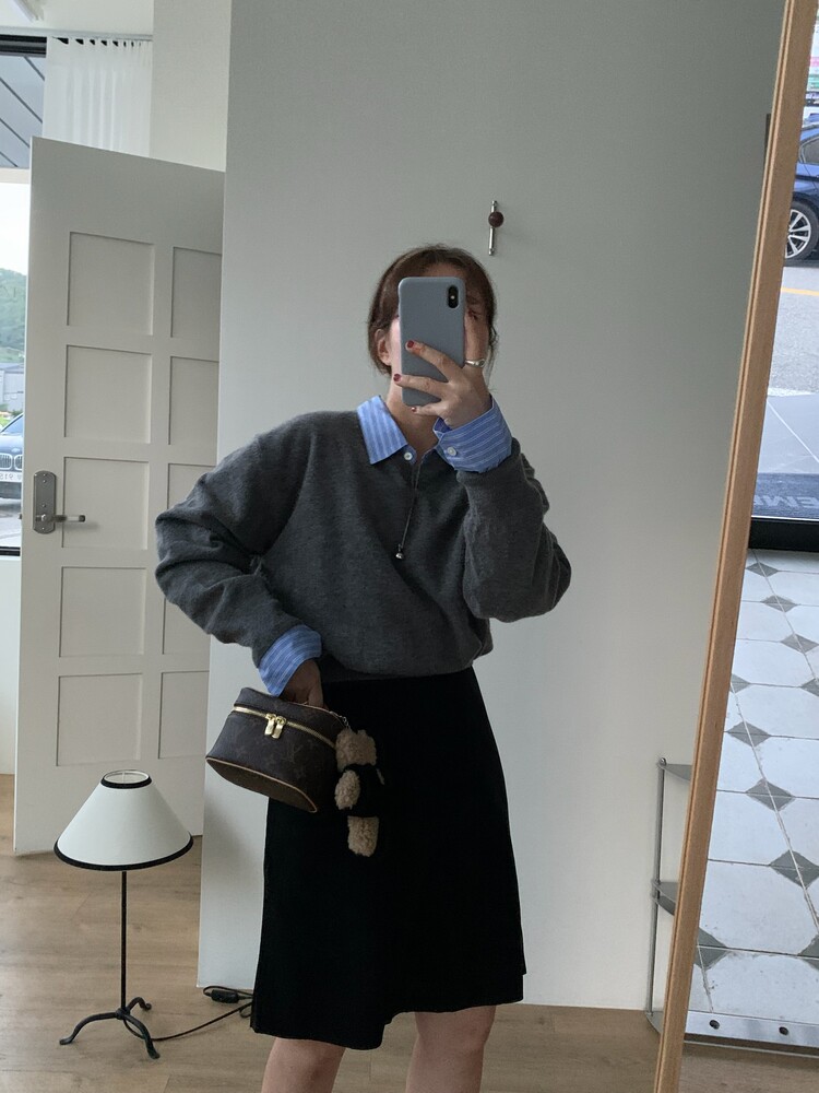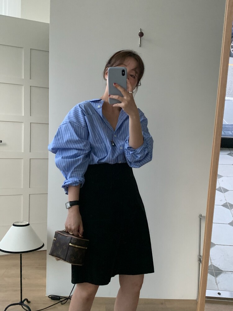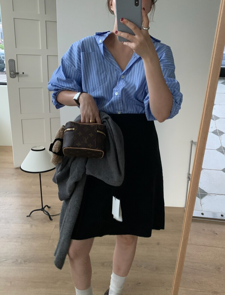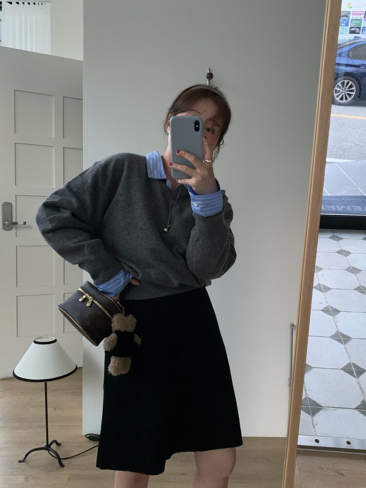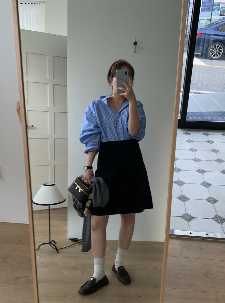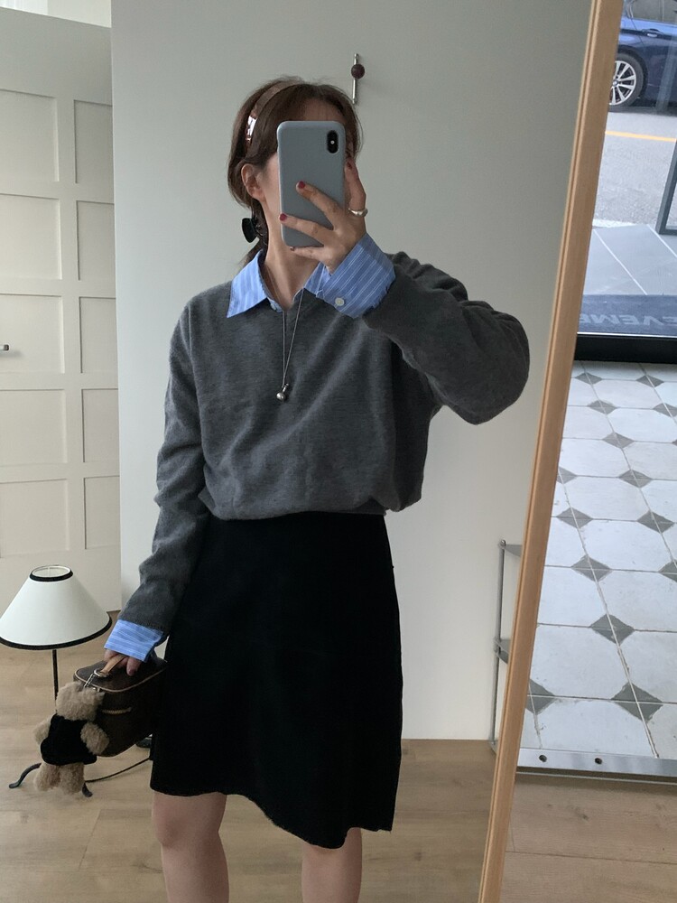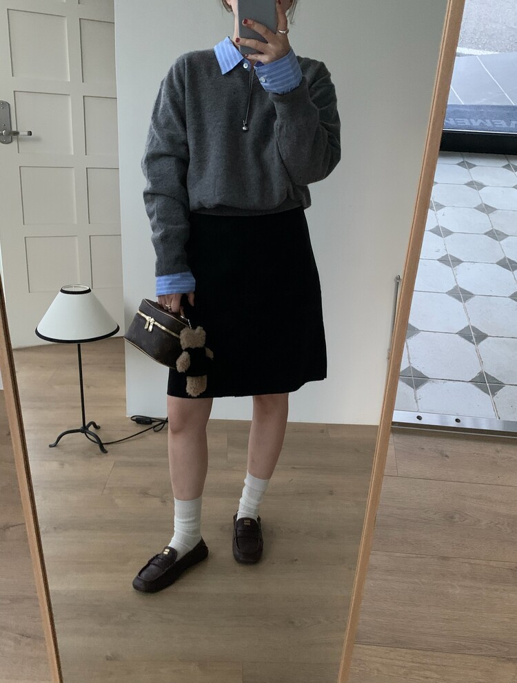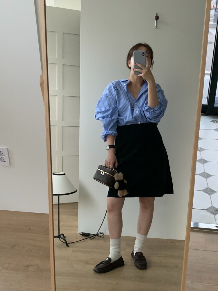 에이라인 핏으로 착용되는 스웨이드 소재의 스커트입니다