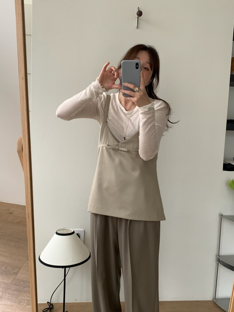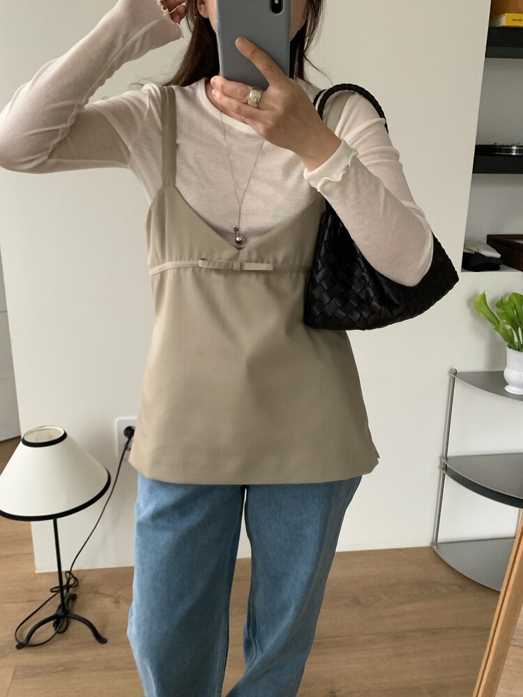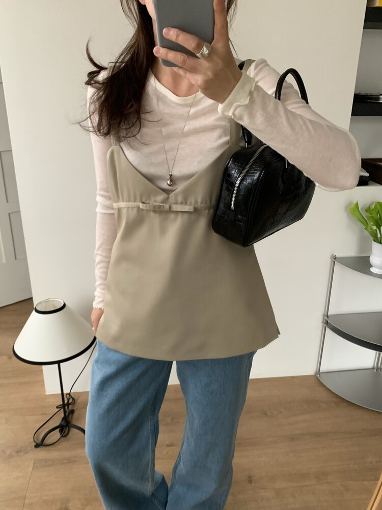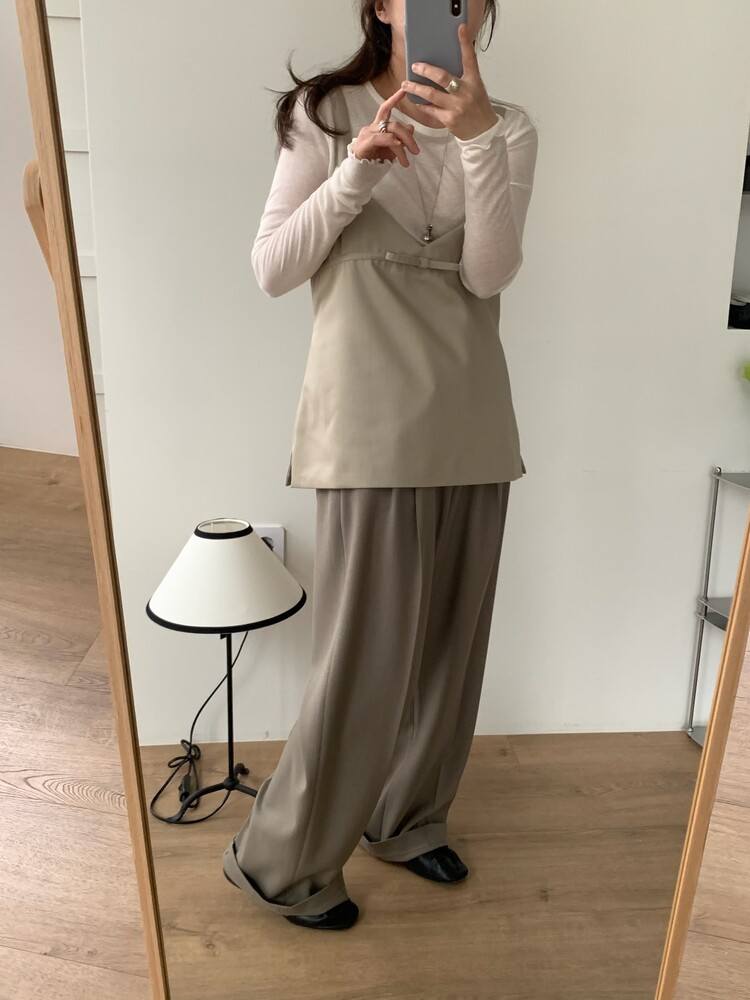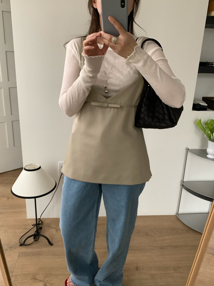 브이넥 라인의 리본디테일과 힙까지 내려오는 길이감이