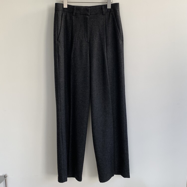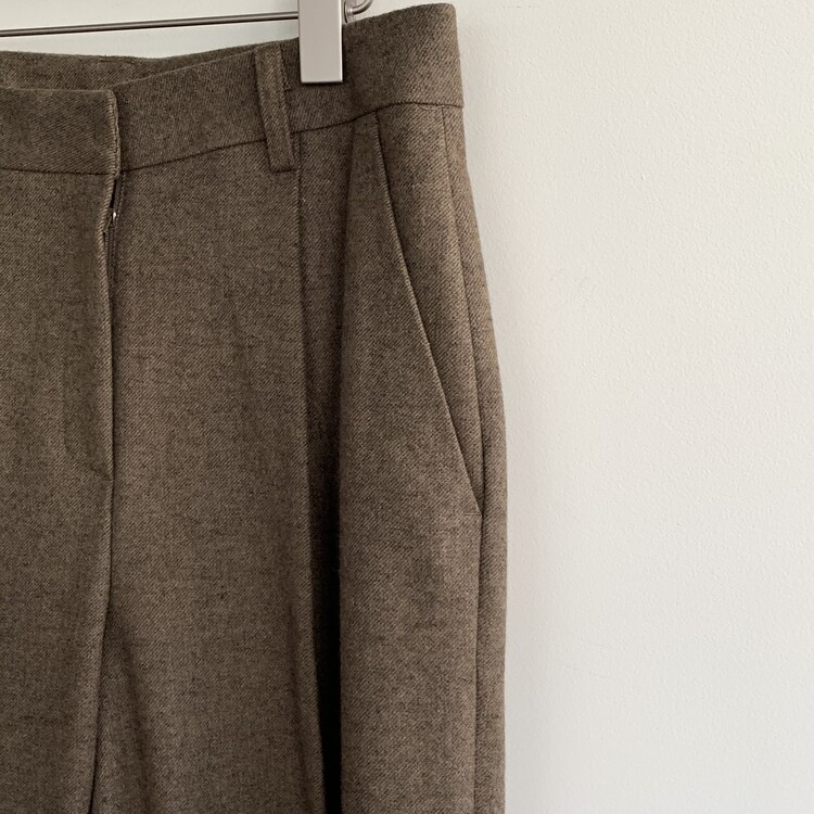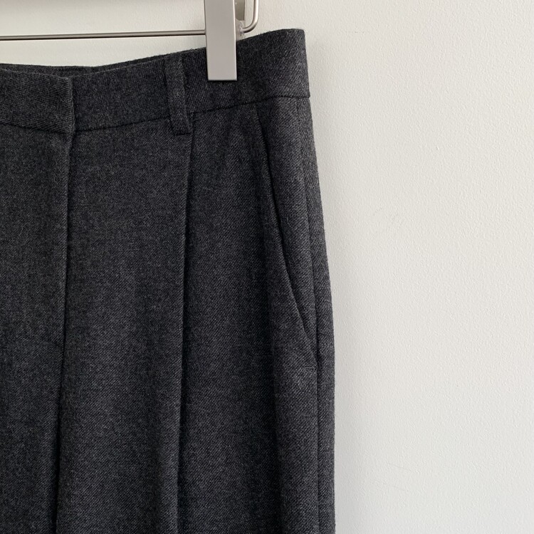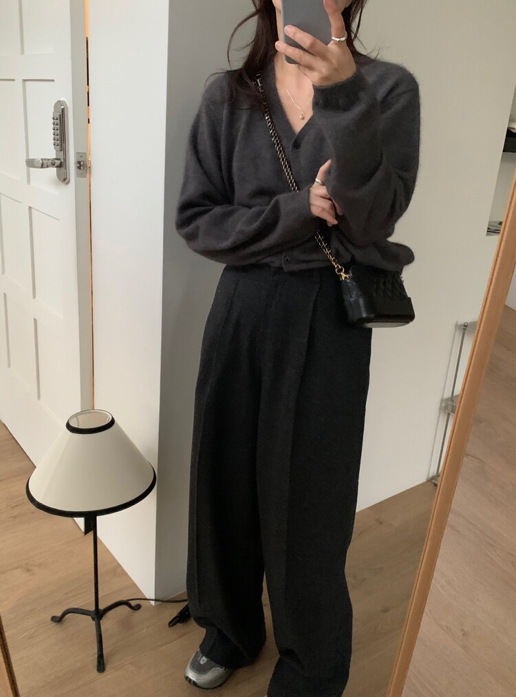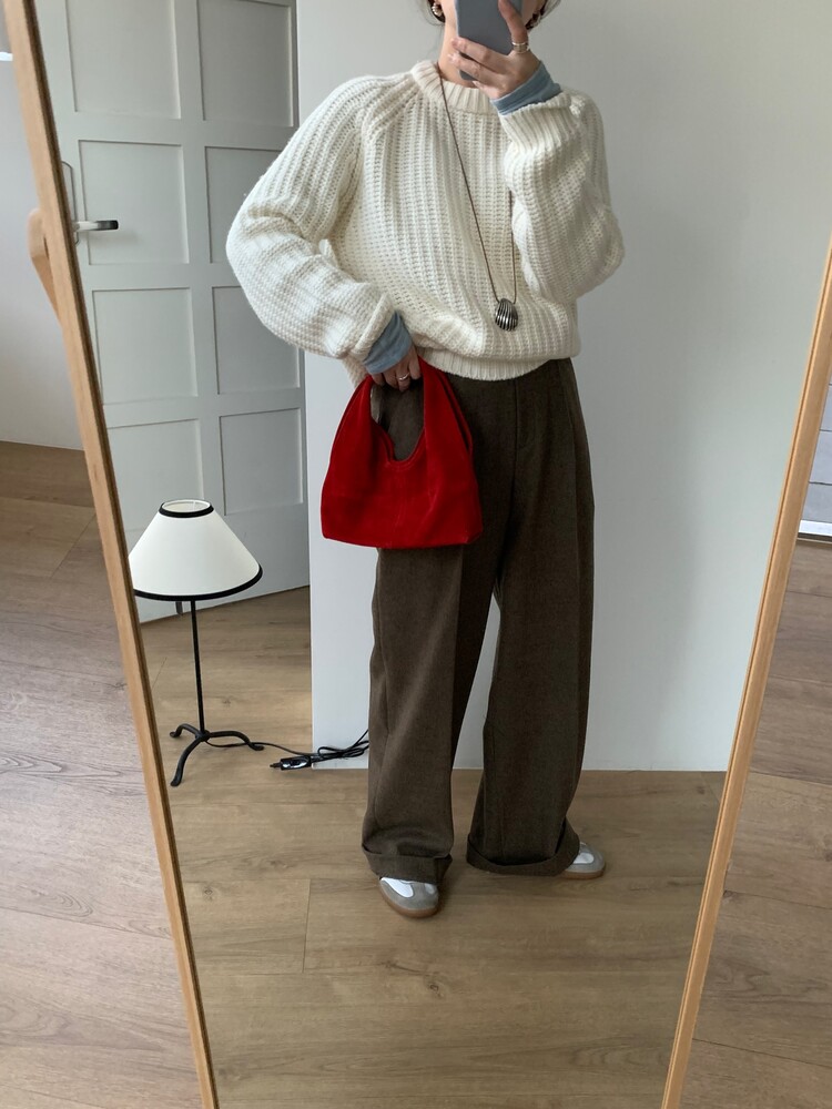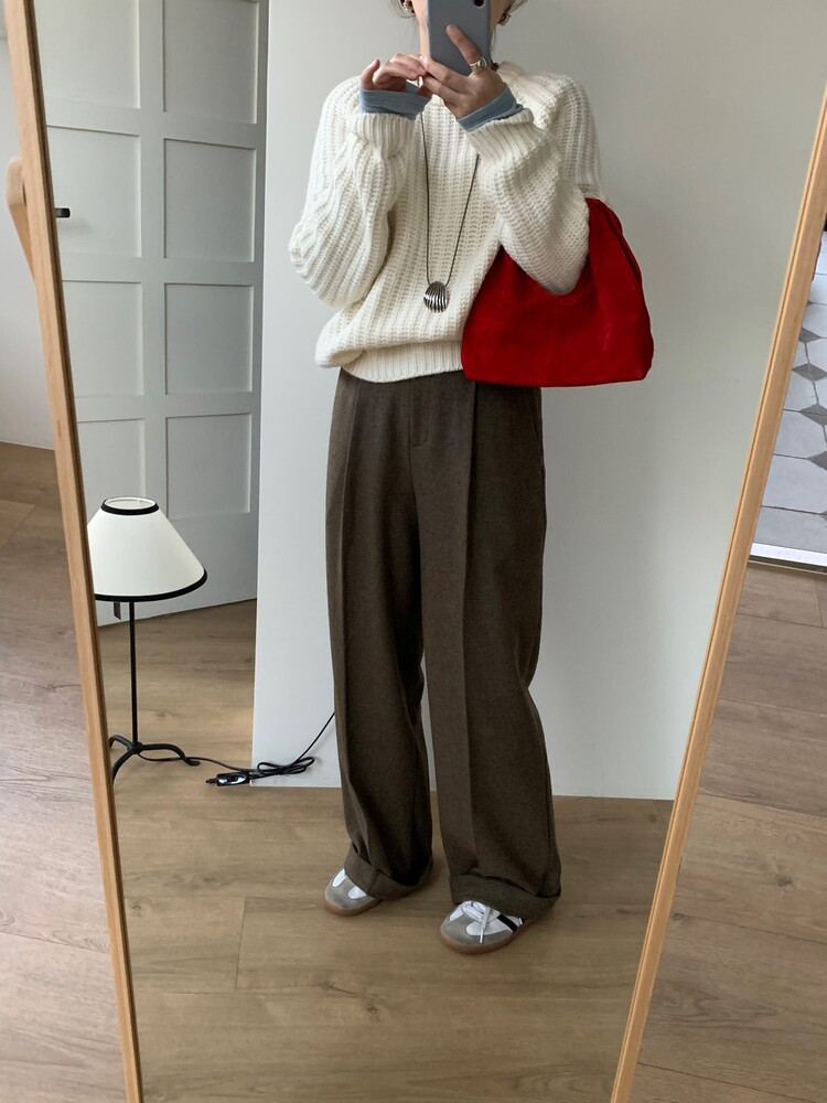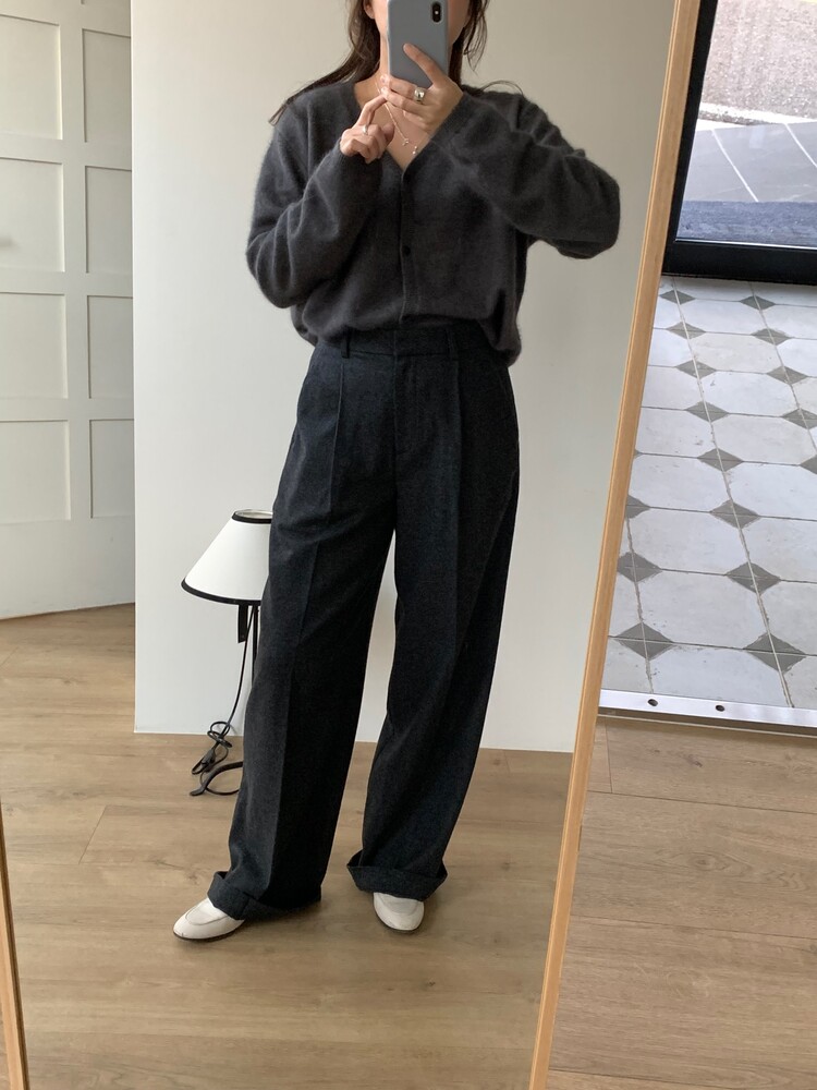 적당하게 떨어지는 핀턱 주름의 와이드 슬랙스 입니다