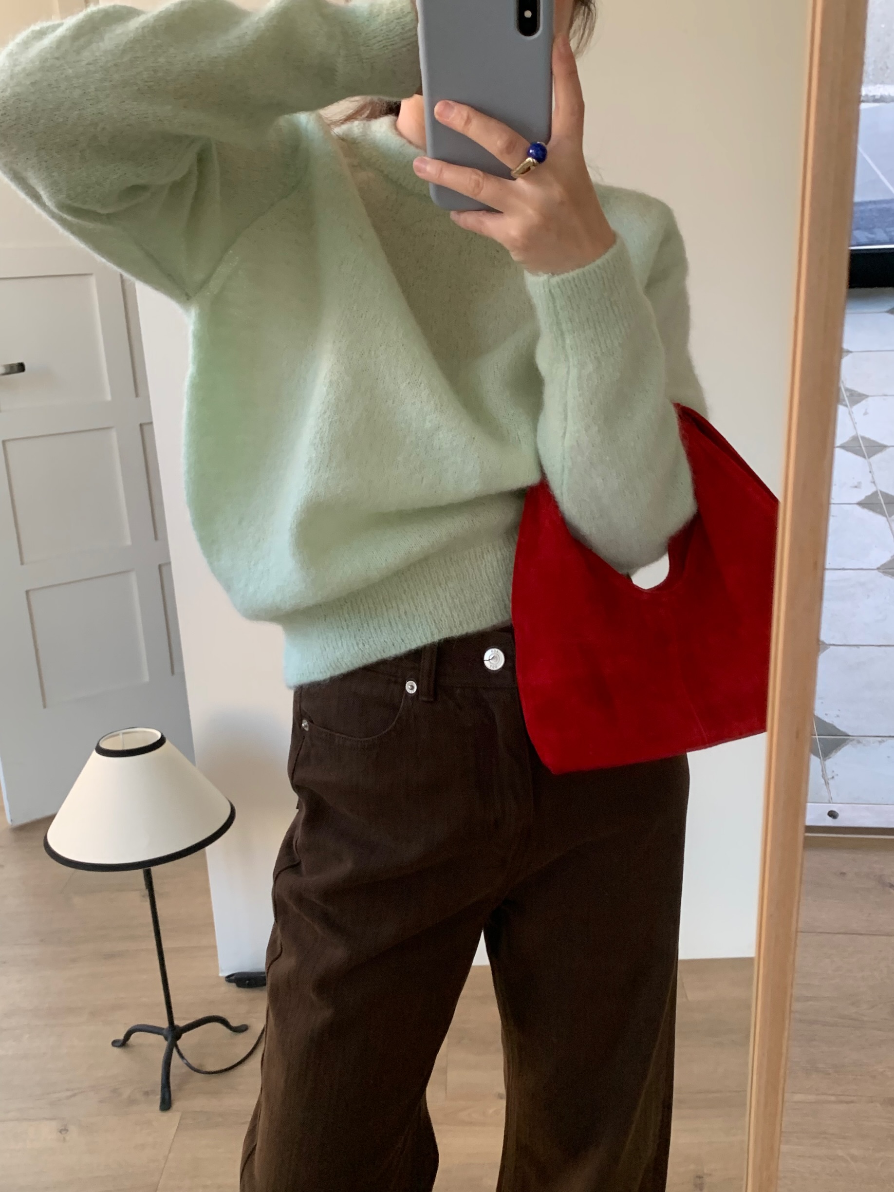 루즈한 핏으로 착용되는 라운드 넥라인의 모헤어 니트입니다