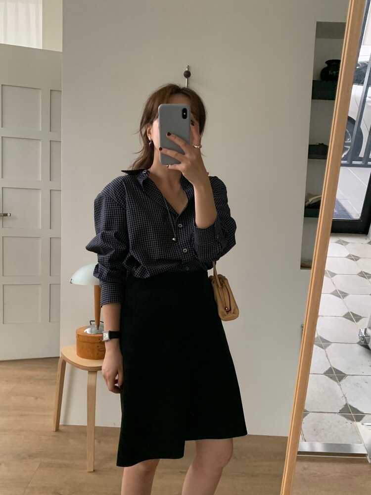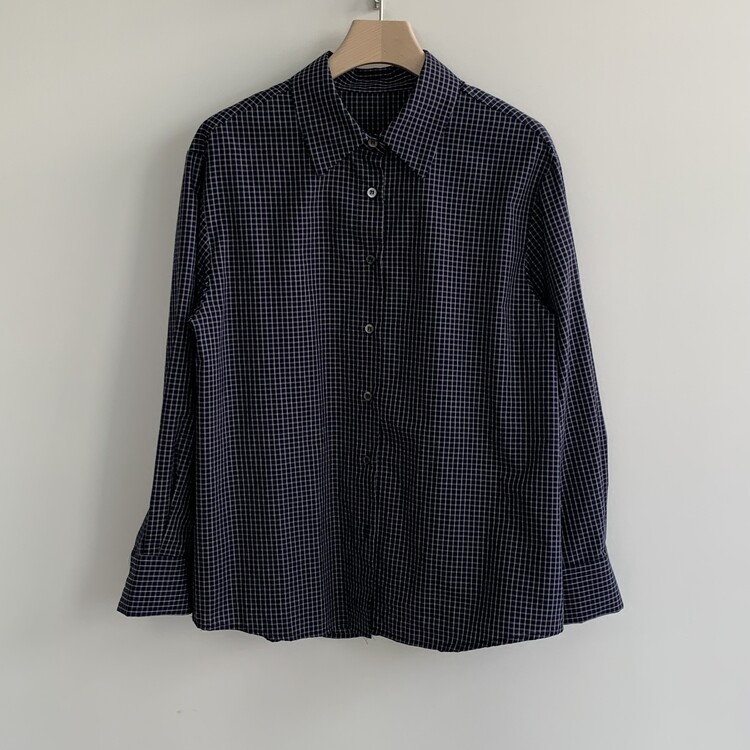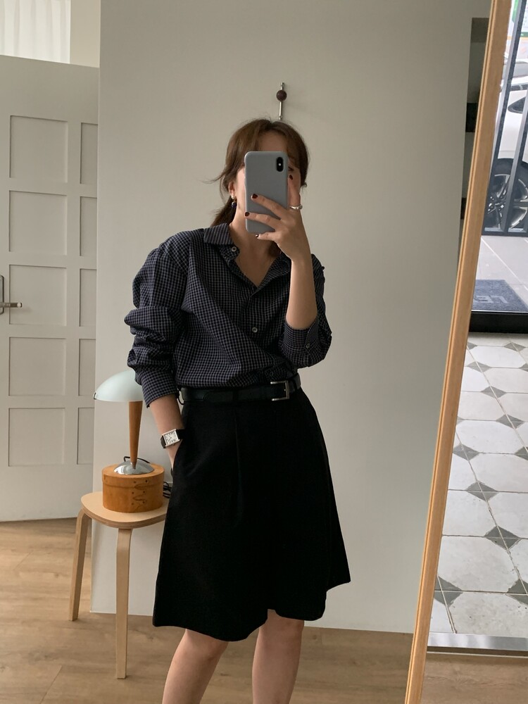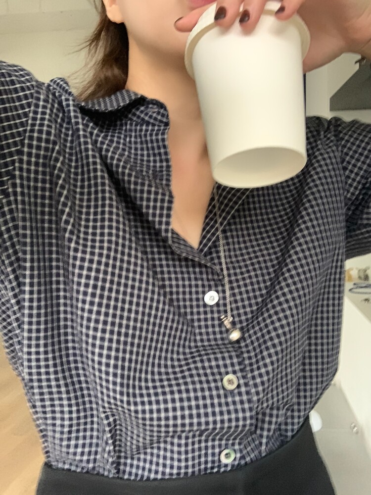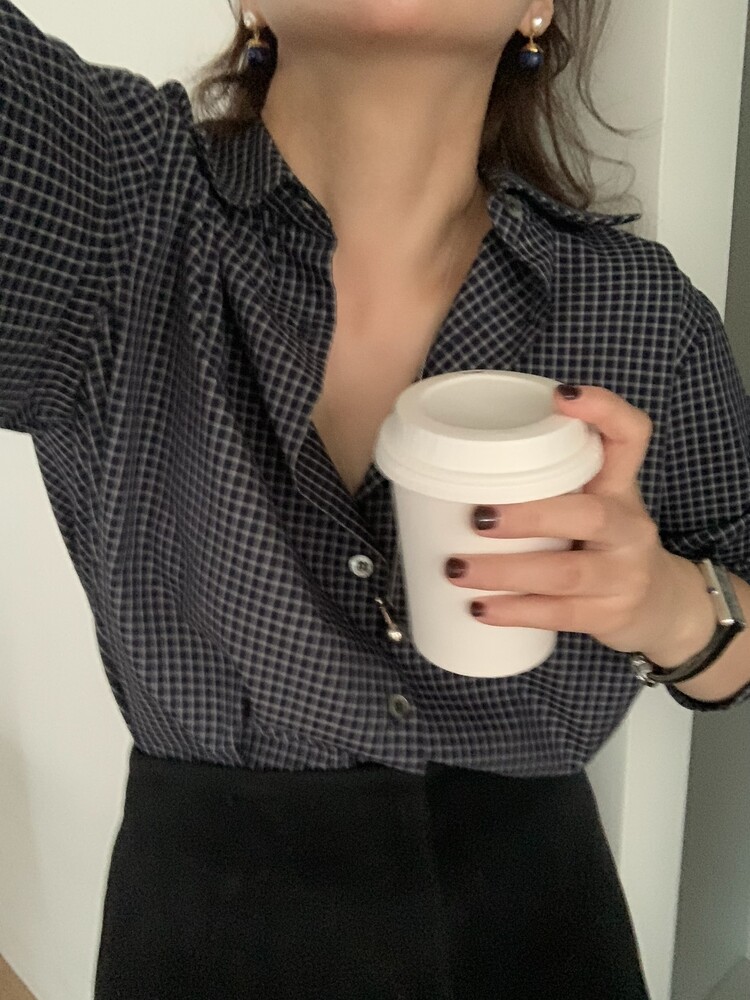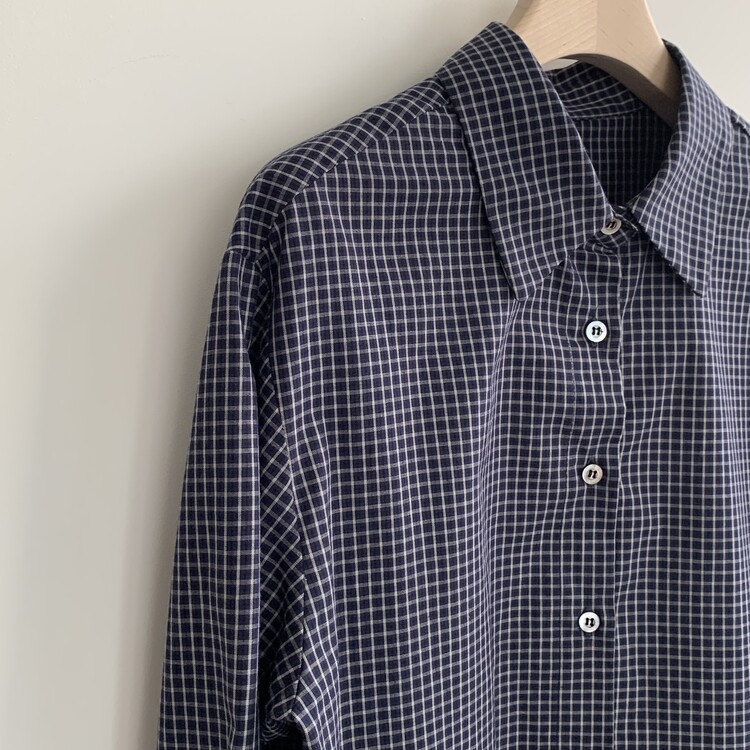 적당하게 루즈한 핏으로 착용되는 잔체크 패턴의 셔츠입니다