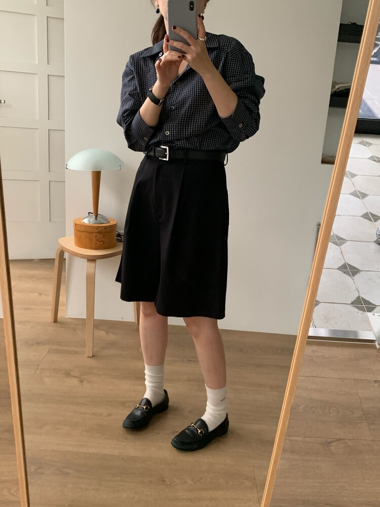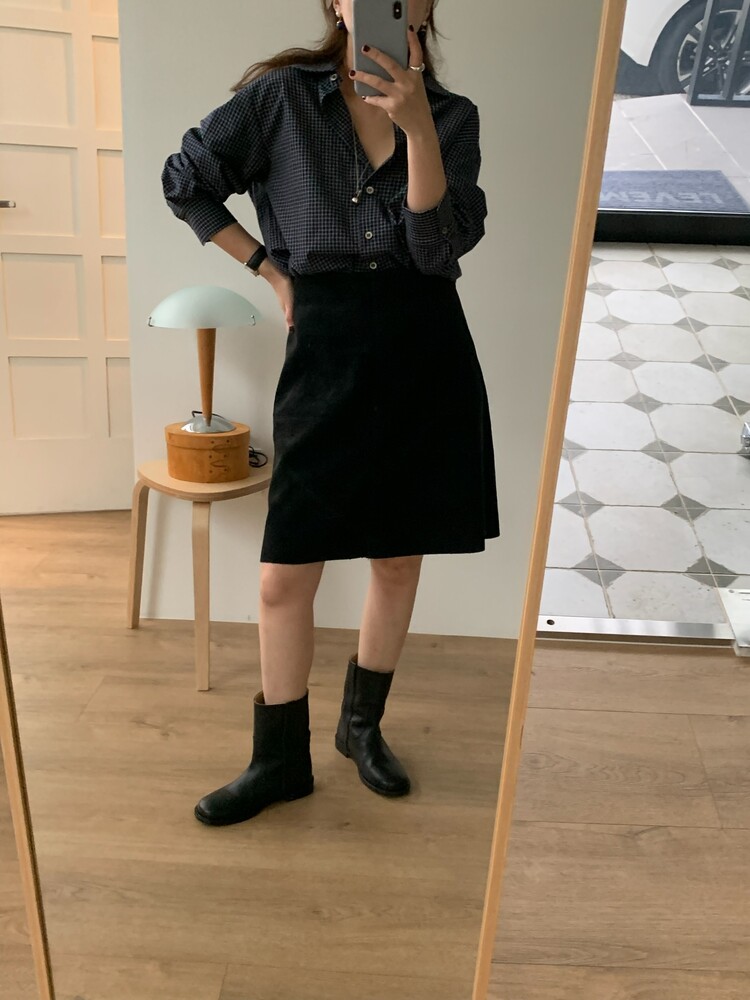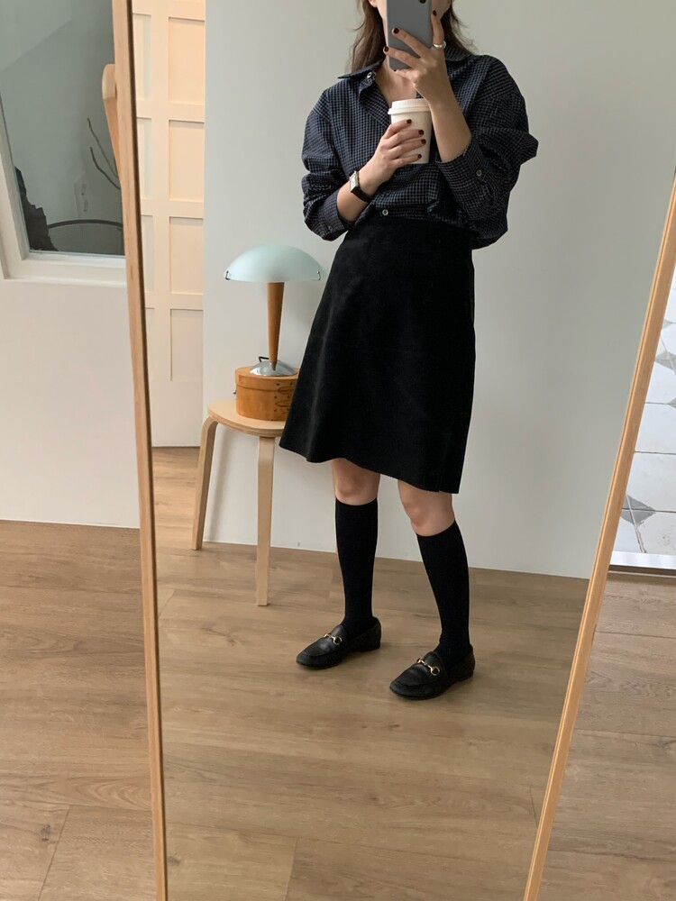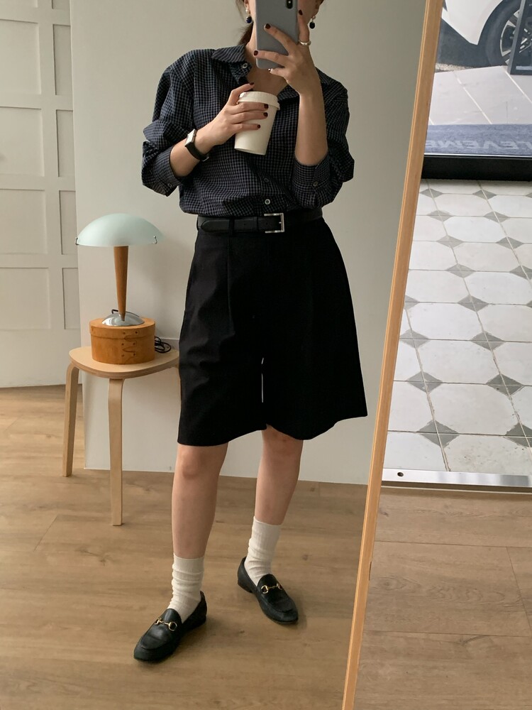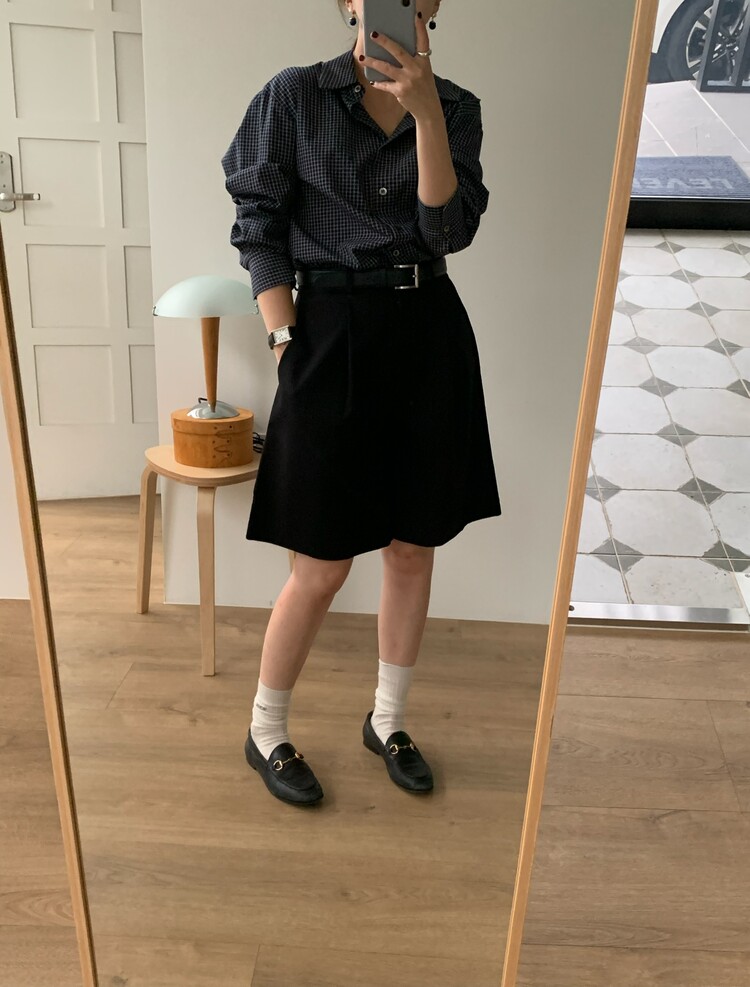 적당하게 루즈한 핏으로 착용되는 잔체크 패턴의 셔츠입니다