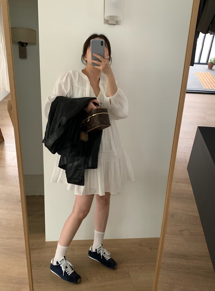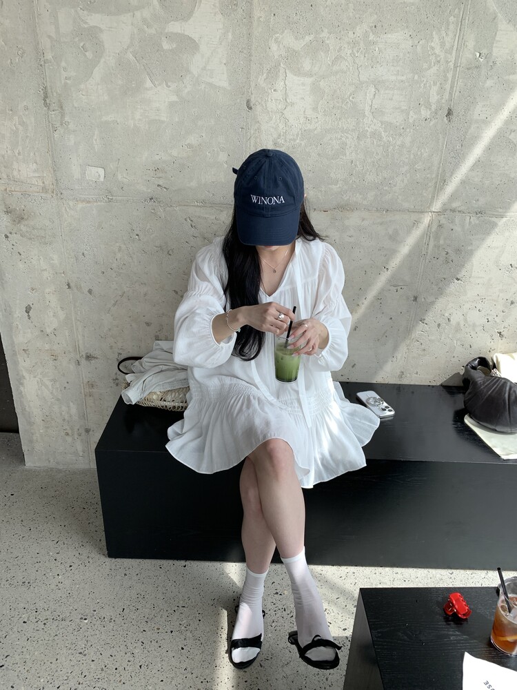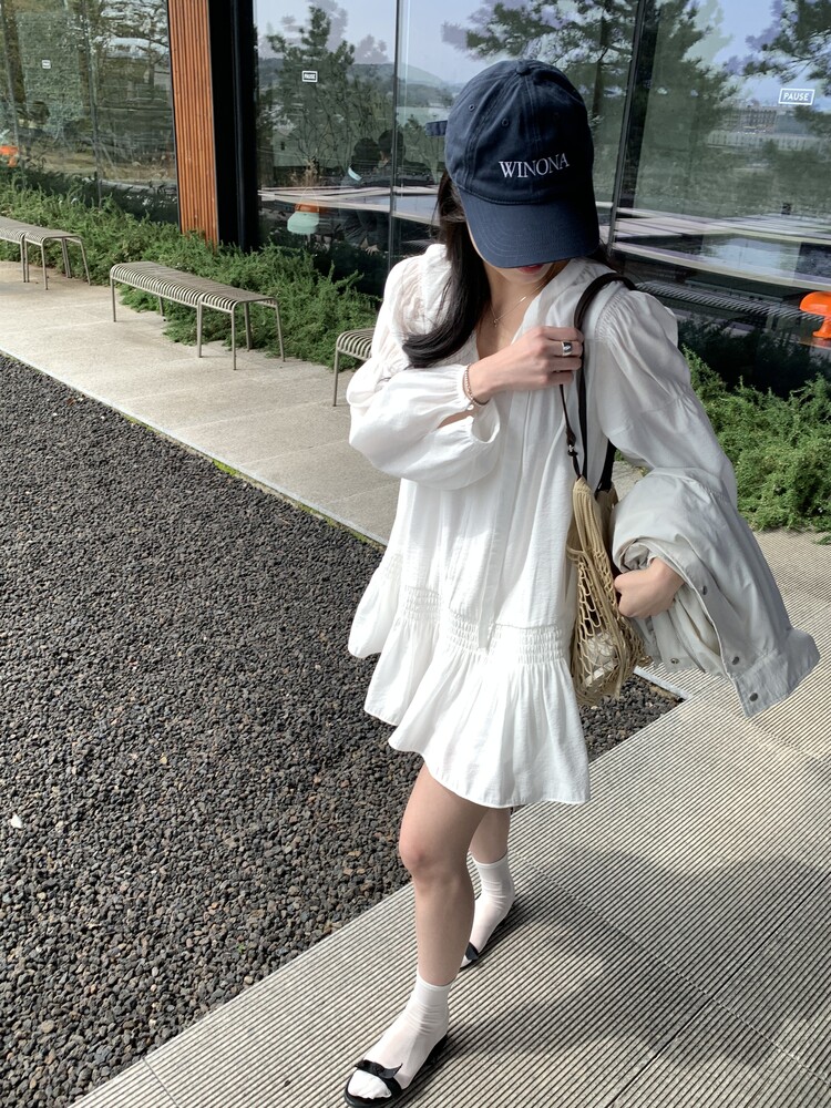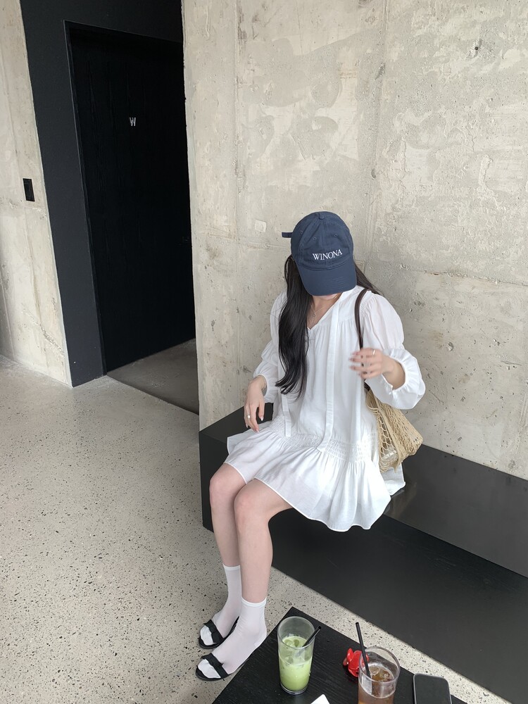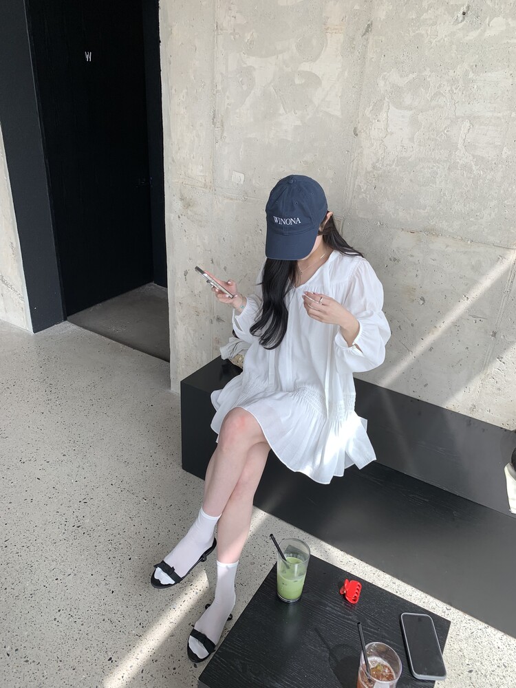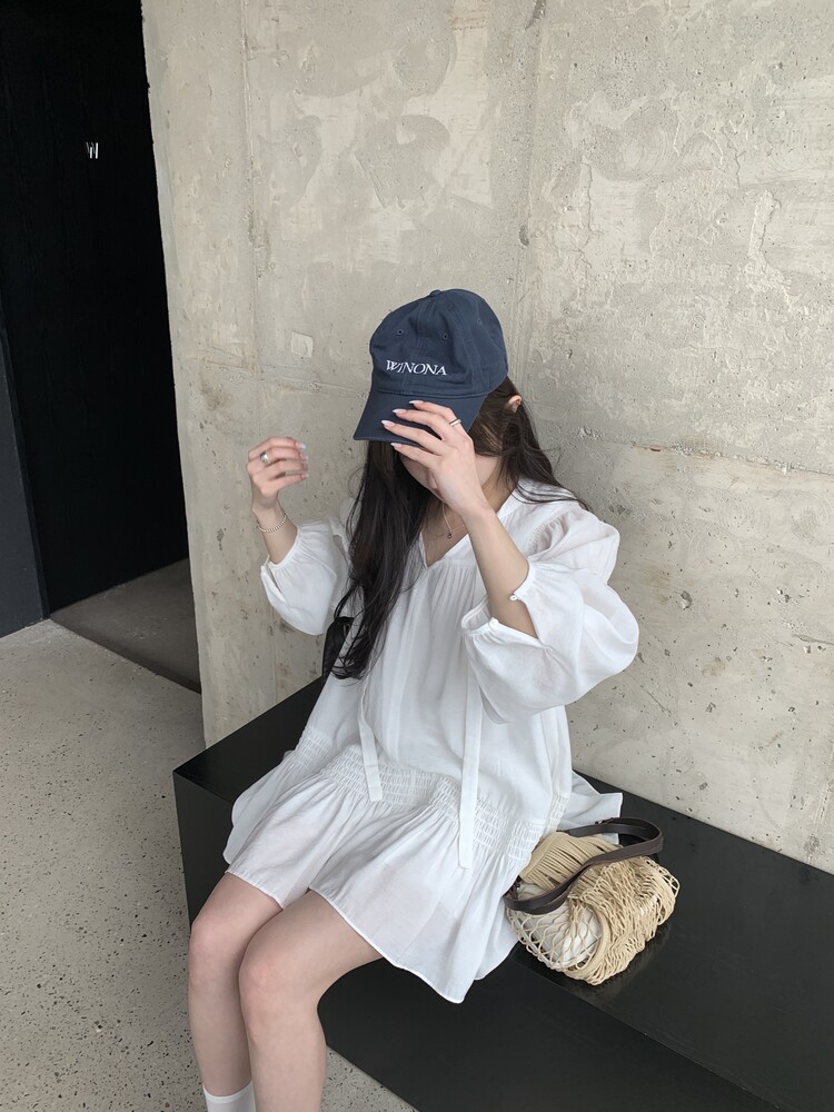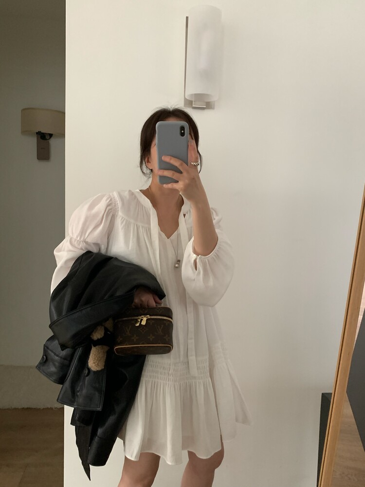 여유있는 핏으로 편하게 착용되는 미니 기장의 원피스입니다