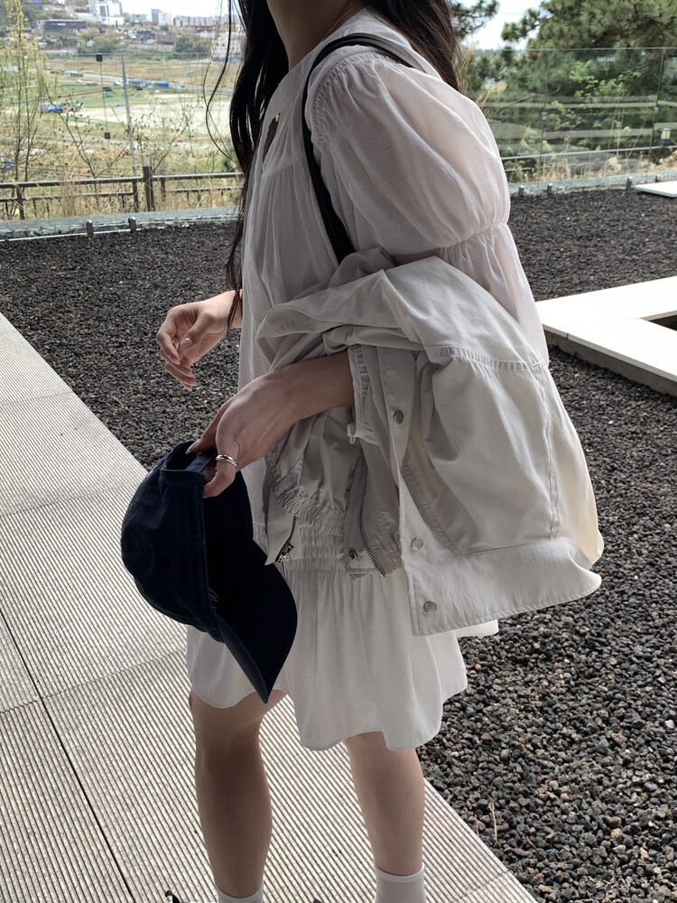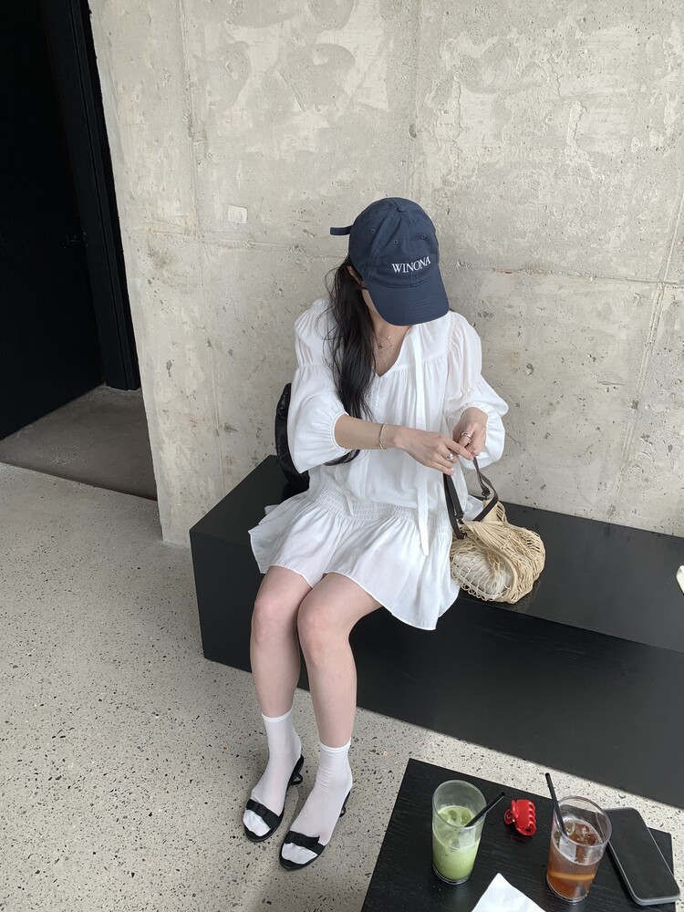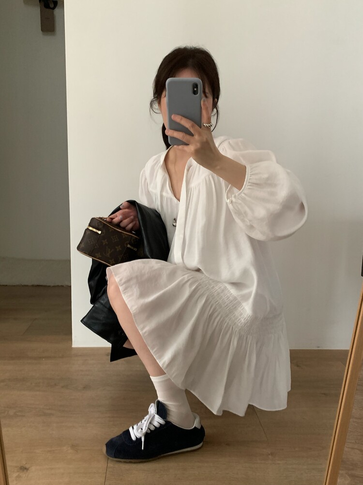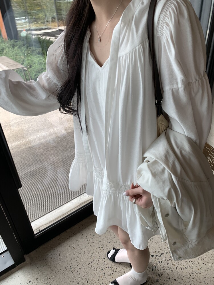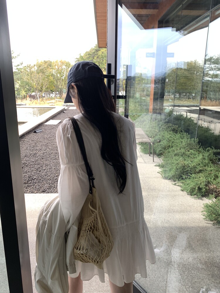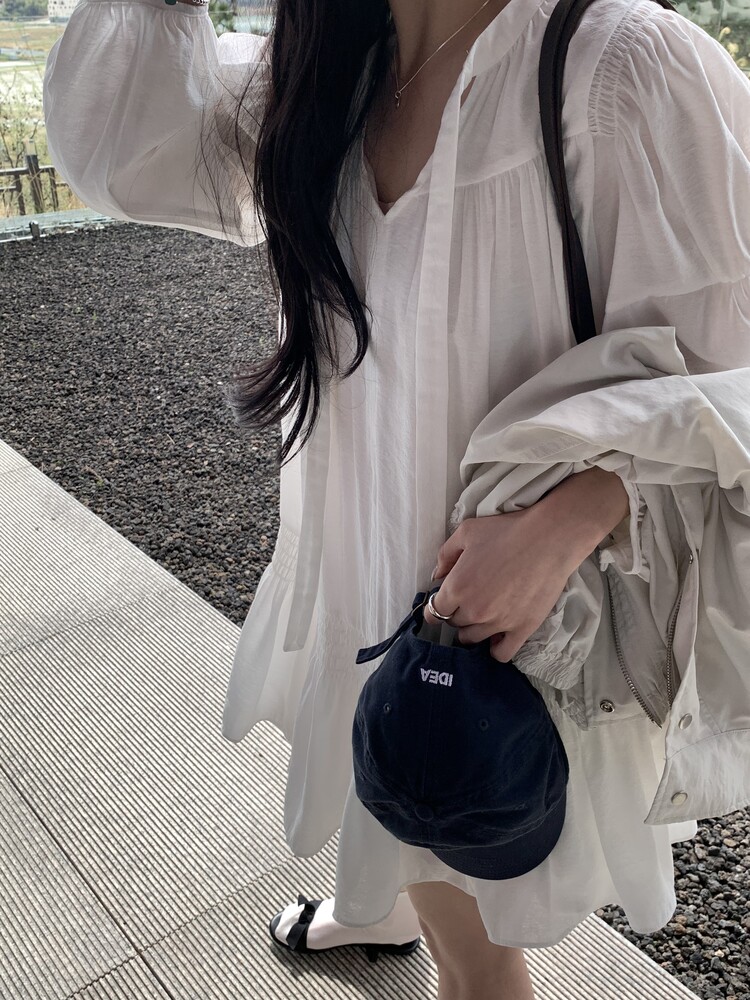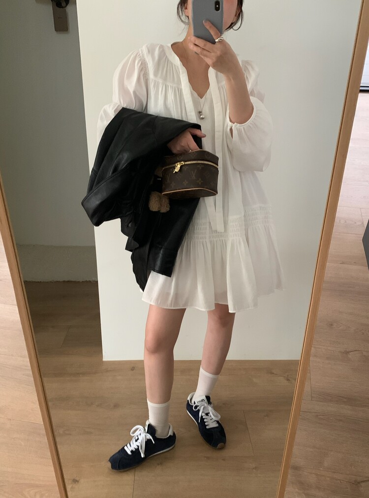 여유있는 핏으로 편하게 착용되는 미니 기장의 원피스입니다