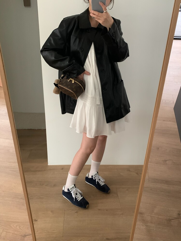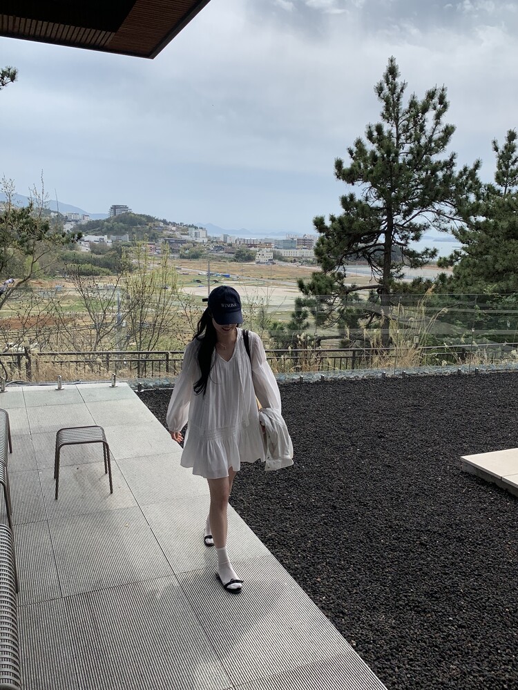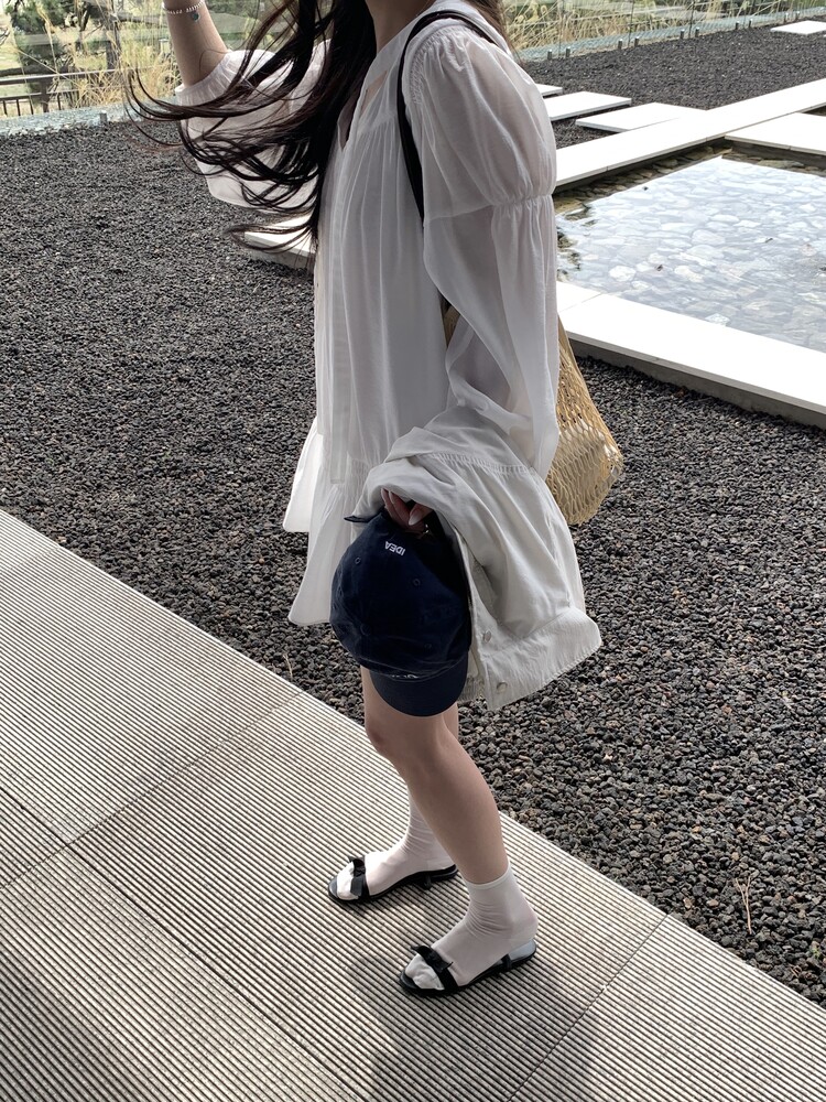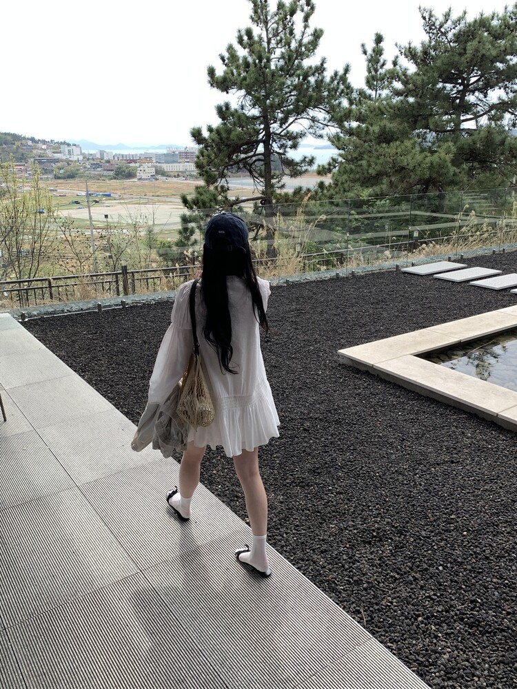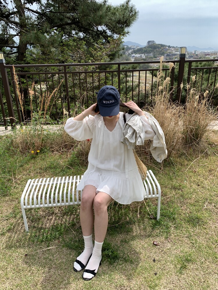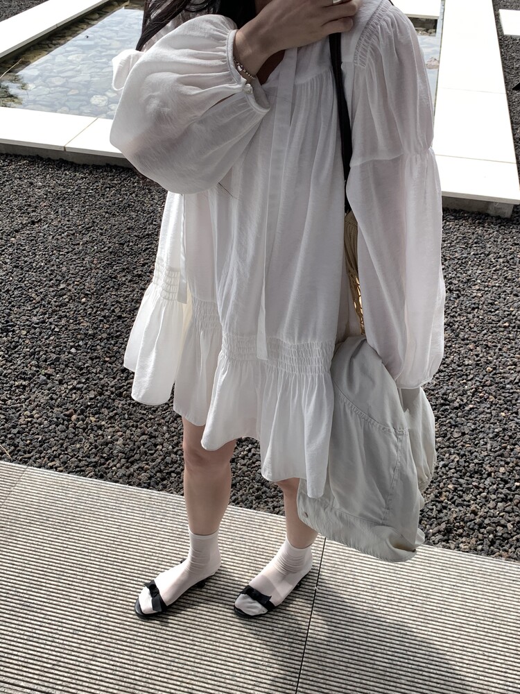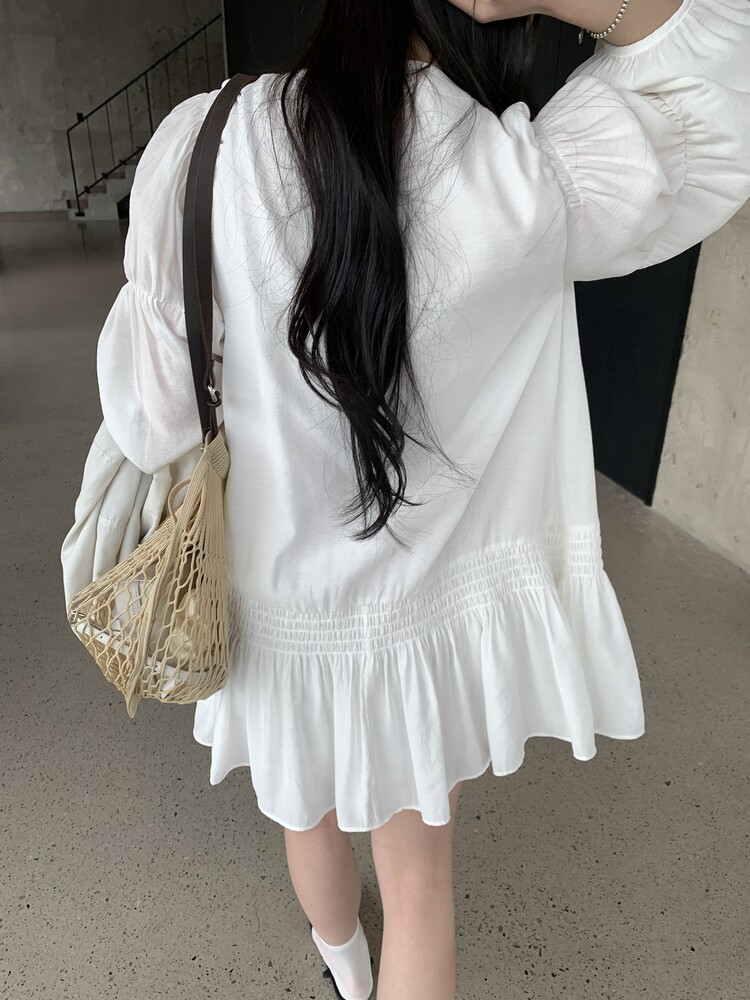 여유있는 핏으로 편하게 착용되는 미니 기장의 원피스입니다